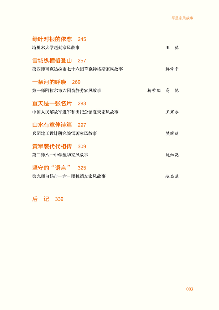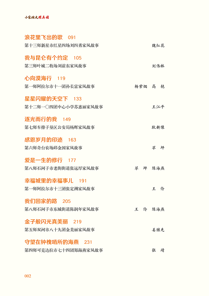 为深入学习习近平总书记关于注重家庭家教家风建设的重要论述,以改革创新精神书写家庭家教家风建设新答卷;同时,为向新疆生产建设兵团成立70周年献礼,兵团妇女联合会向全兵团广泛征集军垦家风故事,从近200篇家风故事中遴选出25个具有代表性的家庭,由兵团作协的创作团队进行创作。选取的家庭既有“一生只做一件事,我为祖国当卫士”的马军武家庭、“七一勋章”获得者魏德友家庭、义务赡养孤寡老人和残障人士的吐尼沙汗·芒力科家庭,也有中国青年五四奖章获得者王军扬家庭、全国三八红旗手朱广兰家庭、全国五一劳动奖章获得者杨辉家庭、全国民族团结进步模范个人刘前东家庭等等;他们皆是平凡生活中的不凡代表,以实际行动诠释了军垦家风的深刻内涵。